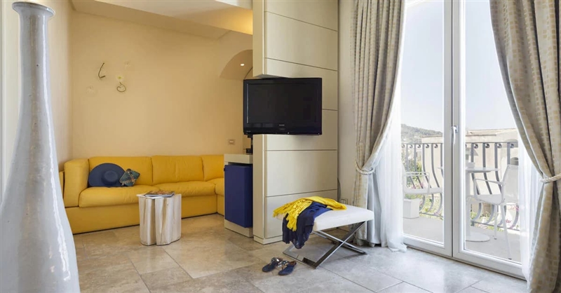 Junior Suite with balcony with side sea view is a delightful spacious and relaxing double room with king bed and large sofa. The room features a large balcony partially overlooking the sea and the characteristic alleys of Anacapri.