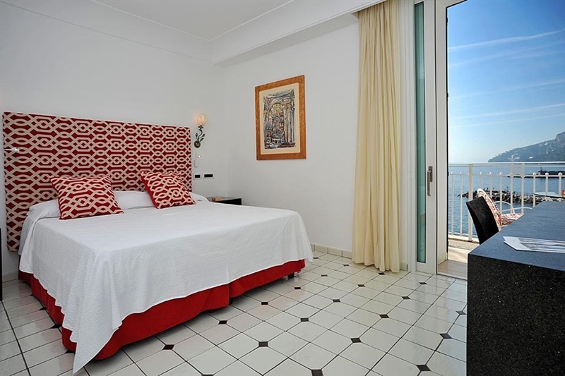 Deluxe Rooms features balcony with view over the sea and Amalfi postcard. Large approx. 20 quare meters, they are characterised by Mediterranean-style hand-painterd Vietri riles. Deluxe eooms have private bathrooms with a bath and walk-in-shower, Carthusia toiletries, Frette bathrobes, 2100 W hairdryer, and offers comforts such smart tv, free wifi, docking station with alarm clock and wireless charger, safe, air conditioning and minibar.